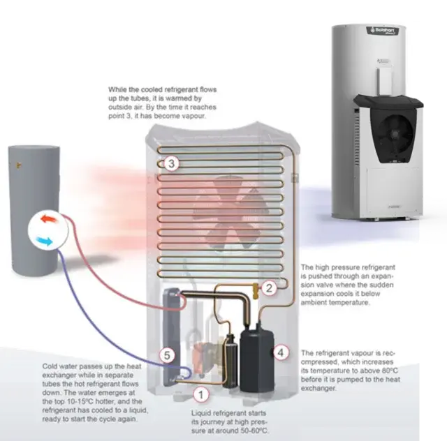 Next, the low pressure vapour needs to be compressed again to return it to its original pressure (4). The temperature has by now reached around 80ºC. From here the refrigerant is pumped to the heat exchanger where it passes down a series of narrow tubes (5). The cold water is pumped up an alternating set of tubes to allow it to absorb the heat. Each time water passes through the heat exchanger it emerges around 10-15ºC hotter. When all the water in the attached storage tank reaches its pre-set temperature, the heat pump switches itself off.